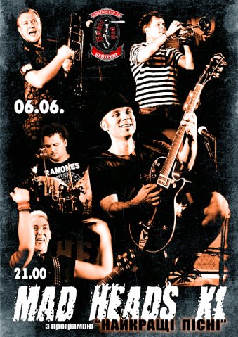 06.06.2010 О 21.00 НАЙПОЗИТИВНІША РОК БАНДА УКРАЇНИ  MAD HEADS XL  ЗАРЯДИТЬ СВОЄЮ ЕНЕРГІЄЮ!!! В ПРОГРАМІ КОНЦЕРТУ – НАЙВІДОМІШІ ПІСНІ ГРУПИ, ВКЛЮЧНО ІЗ ТАКИМИ ХІТАМИ ОСТАННІХ РОКІВ ЯК «А Я НА МОРІ», «НАДІЯ Є», «РОЗСЛАБСЯ НЕ ПАРСЯ», «АВТОБУС БУРАТІН» І БАГАТЬМА ІНШИМИ, А ТАКОЖ ЕКСКУРСИ В РАННІ ПЕРІОДИ ТВОРЧОСТІ.