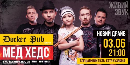 Вперше новий драйв від Мед Хедс можна буде почути та побачити в Докер Пабі 3 червня. Але, окрім нового саунду, хлопці приготували ще один ексклюзивний сюрприз - це спеціальний гість програми маленька та дуже талановита барабанниця Катя Кузякіна. Цьому чуду вже виповнилося аж 7 років, але вона здатна розірвати зади навіть великим дядькам!